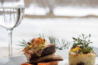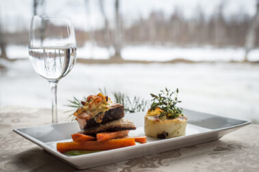 We maken een korte wandeling achter het hotel, waar de paardenslee op ons wacht. Het paard neemt ons mee door het bos en langs de rivier. Je kunt genieten van het prachtige landschap en de stilte om je heen.
