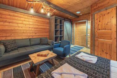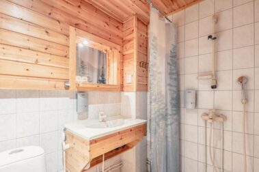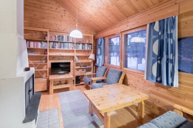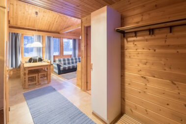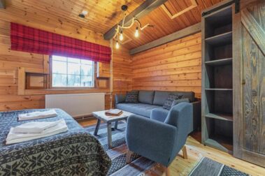 Type C: Jerisranta A blokhutten 36m² (max. 2 volw. + 2 kinderen 7 t/m. 11 jaar) liggen op 50-200 m van het hoofdgebouw en kort bij het Jerisjärvi meer. Ze bestaan uit woonkamer met open haard, sofabed en kitchenette, een slaaphoek met 2 eenpersoonsbedden, droogkast en badkamer met douche, wc en sauna.